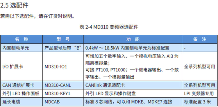 匯川變頻器MD310系列MD310 系列變頻器是一款通用緊縮型多功能變頻器,采用開環矢量和V/F 控制方式,以高性能的電流矢量控制技術可實現異步電機控制。MD310 標配RS485 通訊接口,支持Modbus RTU 通訊,可擴展I/O 擴展卡、CAN 通信擴展卡。內置PID 可方便實現閉環過程控制系統,最多可實現16 段速運行。